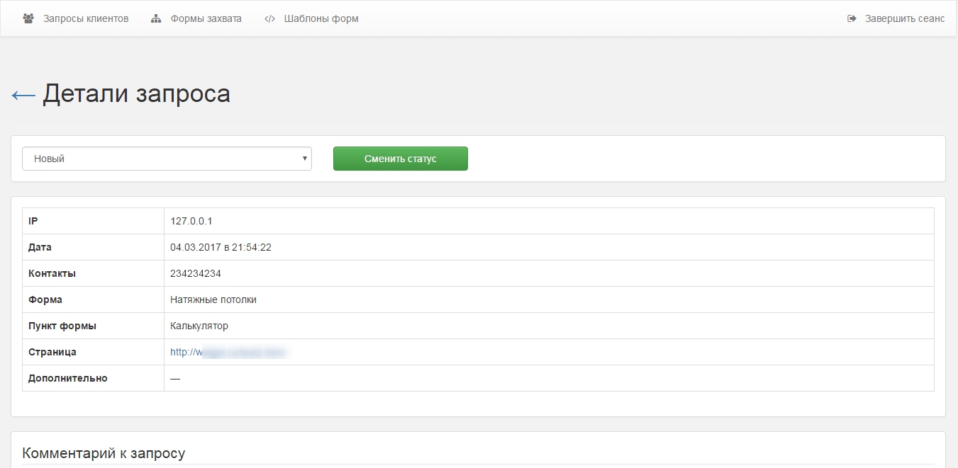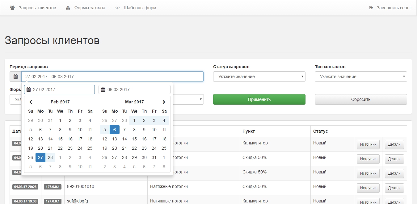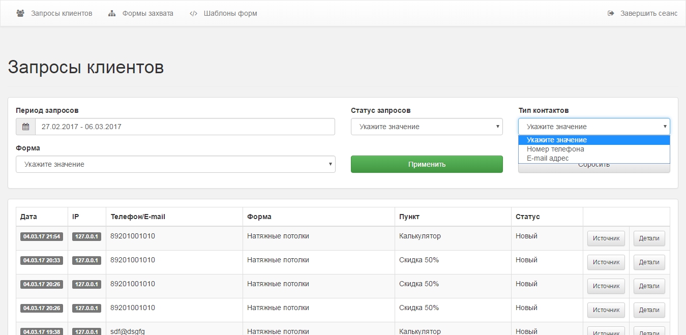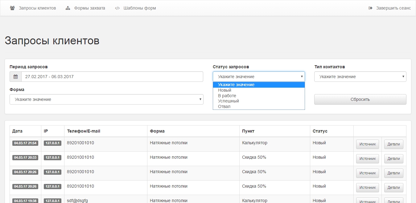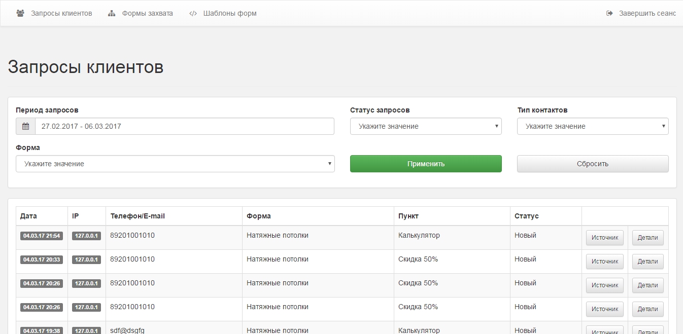 • Централизованное хранение и отображение всех заявок со всех форм захватов и сайтов